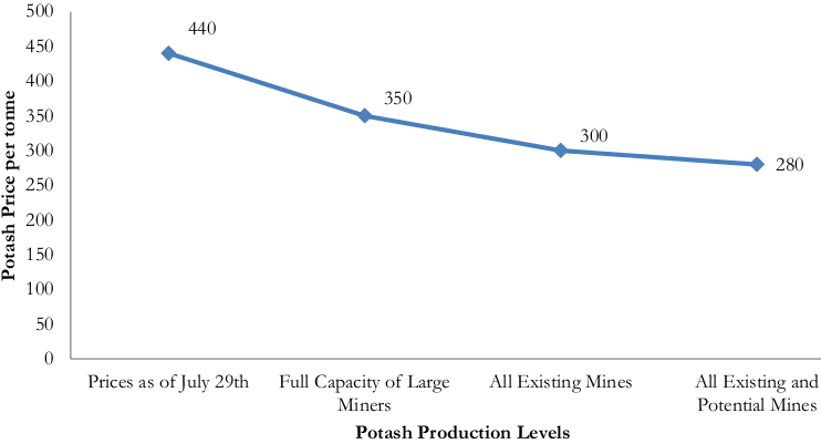 * This poses a serious threat to the potash market as higher volumes will push prices down to $300 as all existing mines move to full capacity.