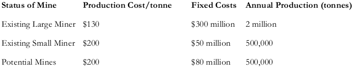 Since we know mines that earn zero profits will stay in business, the equilibrium price is $300/tonne. There is no real reason to calculate the profits of the senior miners, if the candidate does so, they should use the equilibrium $300 price and find that profits are $40 million.