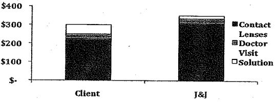 Candidate: Well, first a few observations. Our client Bausch & Lomb has a large share of the global bifocal/trifocal market (70%). While solution and general lens are nice complementary businesses, the money is in bifocal/trifocals. Also, it costs more to outfit a consumer with J&J lens for a year than it does to use our client’s product.