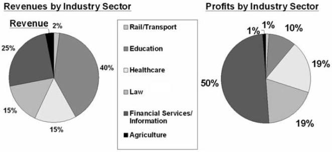 First, again, the education sector seems to make up a large portion of the revenue for the company – but not the profits. Second, it looks like the rail/transport sector doesn’t make up a large portion of the revenue or the profits of the company. Agriculture doesn’t look that necessary, or attractive either. Fourth, it looks like both the legal sector and the health care sector contribute significantly to both revenue and profits.