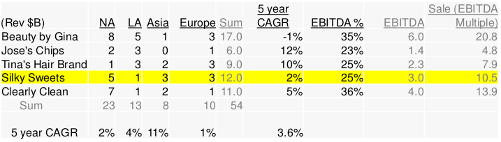 Silky Sweets is the best choice since it meets the target cash value to return to shareholders and has low growth over the past 5 years.