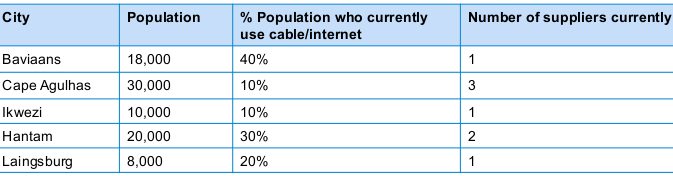 * In Baviaans, 7,200 people currently use cable/internet. There is 1 competitor, so if our client enters now, they will have 7,200/2 = 3,600 customers (assuming market share will be split evenly in the long term)