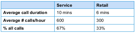 – 300 retail calls/hour means that 300/10 = 30 employees are needed per hour