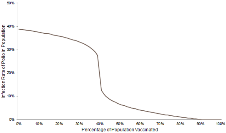 In the long term, they should target some number between 80% and 90% so that they can fully eradicate polio. As a result of the herd immunity effect, they do not need to vaccinate 100% of people to achieve a 0% infection rate (in this graph, infections hit 0% at 86% vaccination).