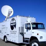 satellite dish antenna which is pointed at a communications satellite, which relays the signal back down to the studio. Satellite communication allows transmission from any location that the production truck can reach, provided a line of sight (direct view) to the desired satellite is available.