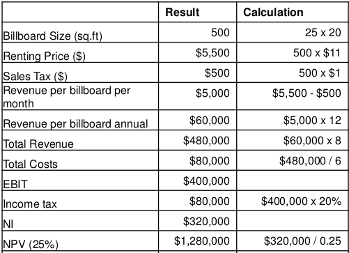 * The size and price are the same for all 8 billboards as shown in Exhibit 1.