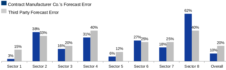 * Exhibit 1: the first insight here is that third party forecasters are just as inaccurate and indeed in most cases, more inaccurate than Contract Manufacturer Co. at forecasting the market. The taller the bar, the greater the forecast error and therefore the less accurate the forecast. The second insight is that the accuracy differs across sectors, so the candidate should begin to think about the applicability of this work to specific sectors.