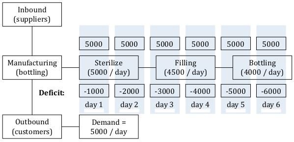 5,000 bottles imported per day lead to dramatic queue = deficit of 1,000 bottles per day.