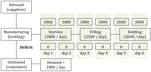 (4) Move quality assurance (QA) before the bottlenecks: 5% out of 4,000 is 200. If quality control is shifted before the bottlenecks, then bottlenecks can operate at 100% (or close to it). This solves for 200 bottles per day.