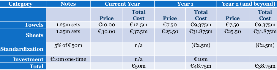 **Note that the 5% price drop due to standardization of design could also be incorporated into the price above, which would make the price of towels €7.50 – €10*5% = €7.00 and the price of sheets €25.50 – €30*5% = €24.00