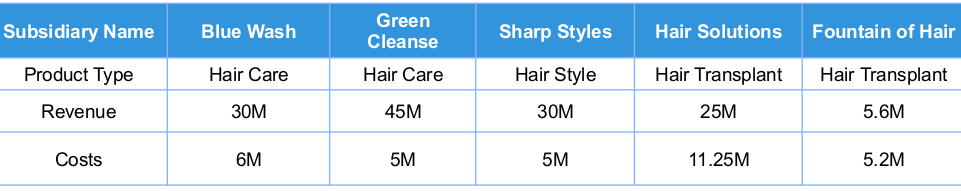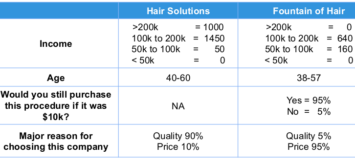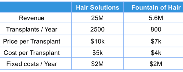 The CEO of L’Oreal has set up a meeting with the heads of FoH and HS. The head of HS says that her company specializes in high end clients and the head of FoH says that his company specializes in low end clients. Both say the potential market for hair transplants is about 3,500 transplants per year. They also provide company information as requested (show Exhibit 2)