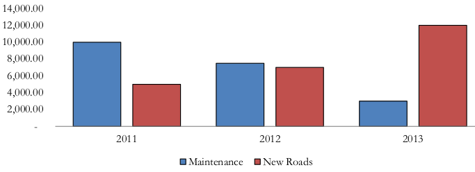 * New roads take on average three times as much time and materials to build per kilometer as maintenance.