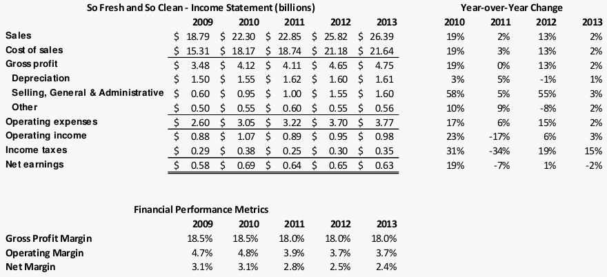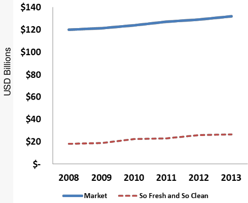 * Questions about the industry: Market has averaged 2% growth over the past five years. So Fresh and So Clean is the industry leader with 20% market share, followed by Competitor A at 15%, Competitor B at 8%, Competitor C at 5%, and others make up the rest.